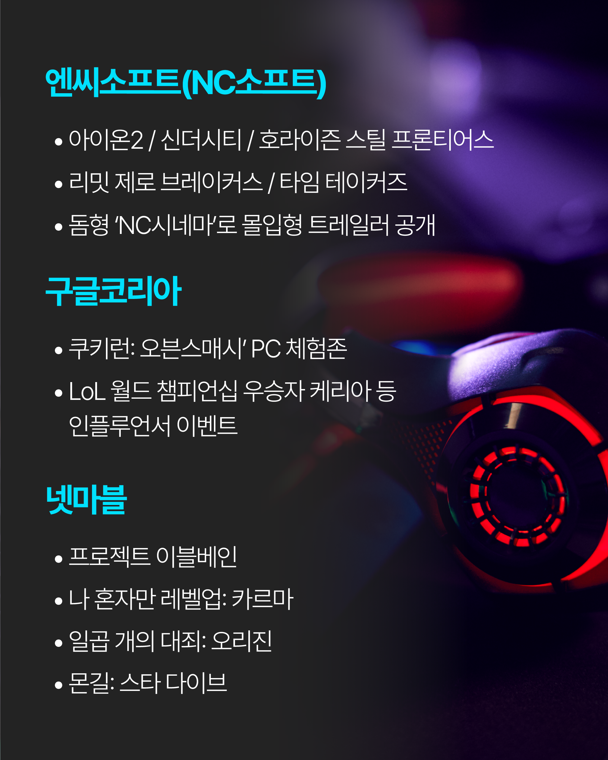 - 주요 신작: 아이온2, 신더시티, 호라이즌 스틸 프론티어스, 리밋 제로 브레이커스, 타임 테이커즈